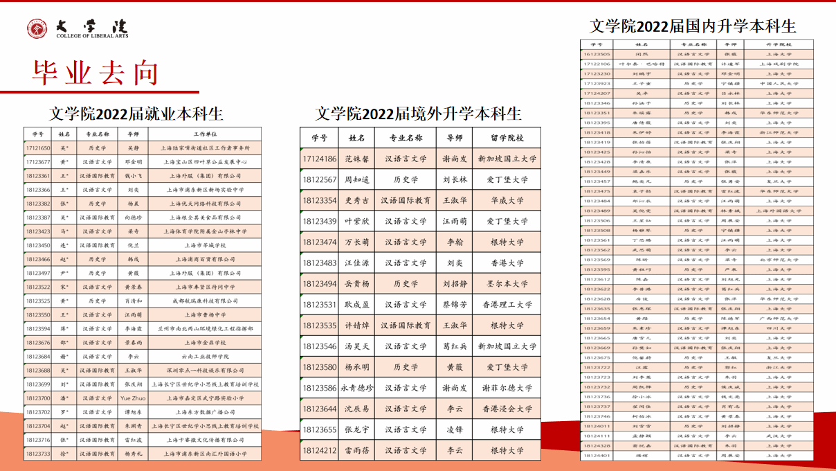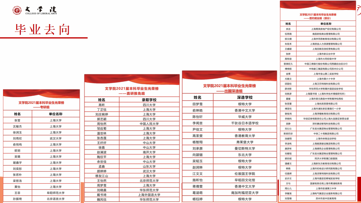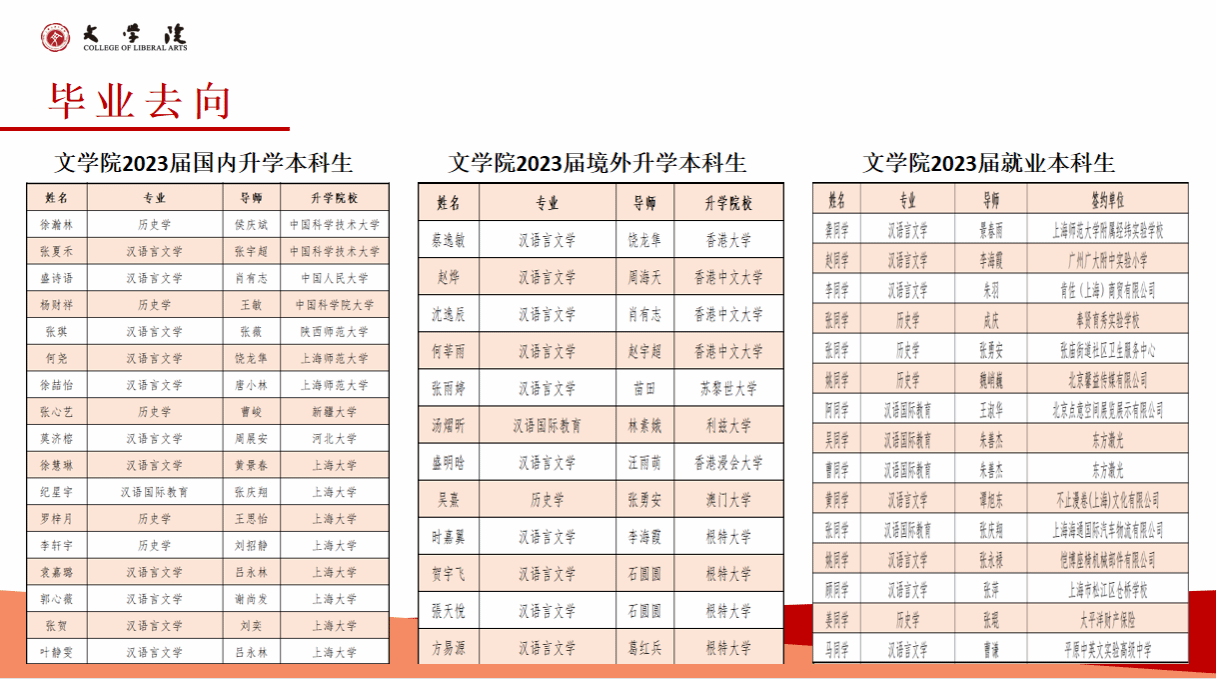 英国beat365官方网站2023年的本科毕业生的就业率为89.66%,就业方向主要集中在教育、机关事业、文化艺术、出版编辑等行业和领域,就业行业的分布相对较广,其中部分优秀毕业生入职华为、腾讯、振华重工等全球五百强企业。近年来,超过30%的本科生毕业后选择继续深造,其中2023年继续深造比例达47.4%。多人考取或免试直升复旦大学、中山大学、中国人民大学、武汉大学等国内名牌大学。出国(境)深造比例也在持续提升,2023年出国(境)学生中,50%进入QS全球排名前100的国际一流高校攻读硕士学位,香港大学、香港中文大学、利兹大学、苏黎世大学、诺丁汉大学等。