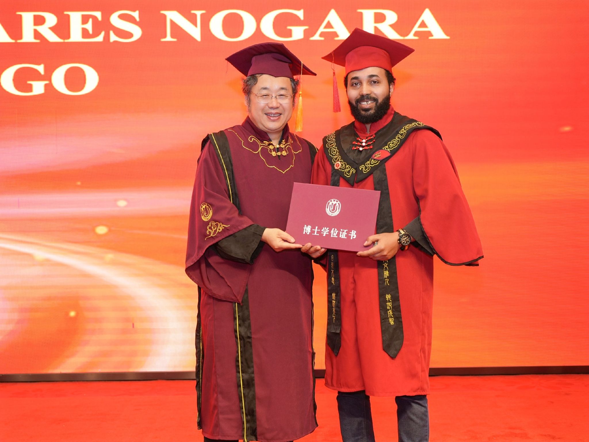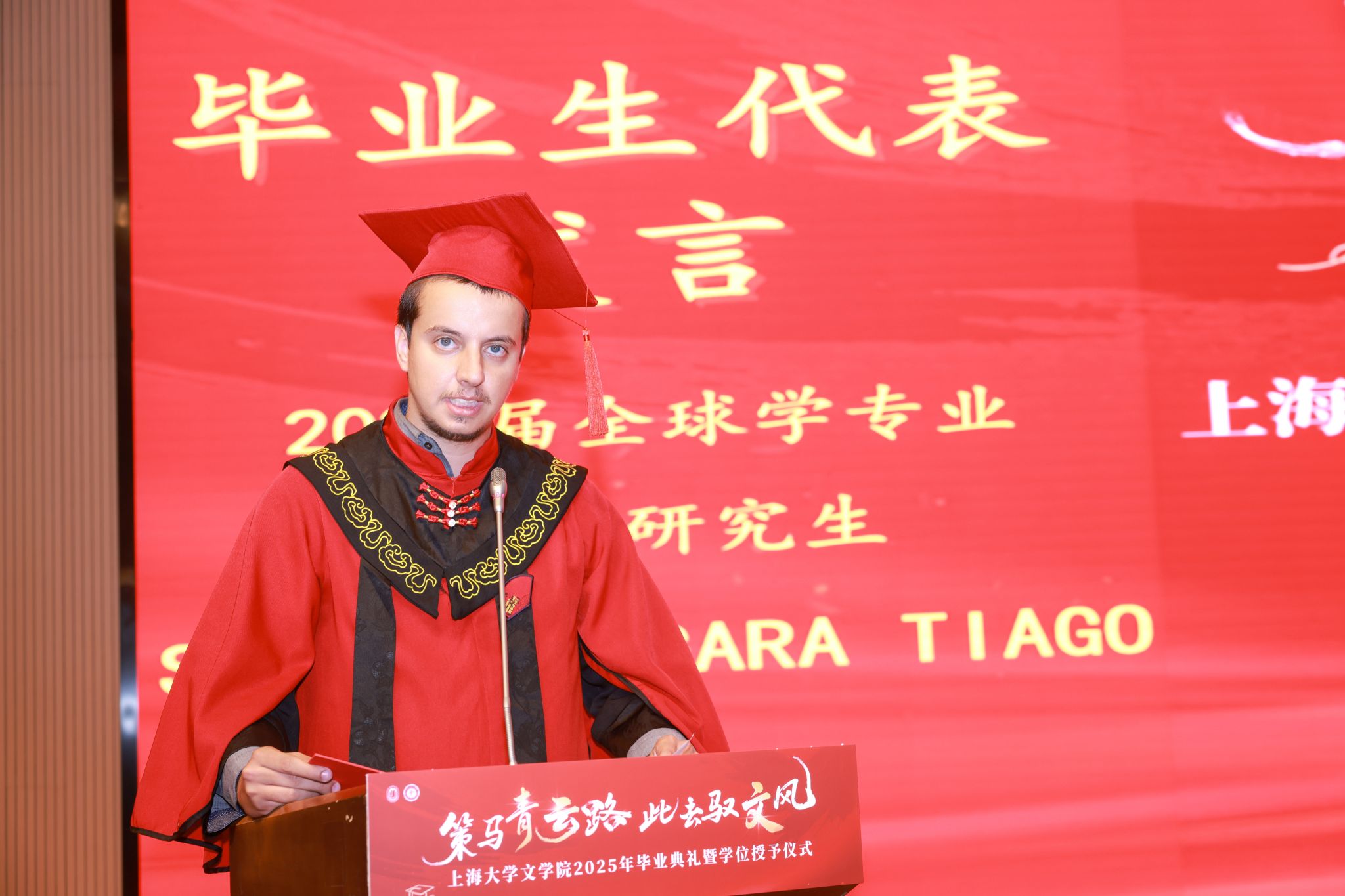 2025届全球学专业博士毕业生SOARES NOGARA TIAGO蒂亚戈·诺格拉作为学生代表发言,他首先感谢了中国人民和英国beat365官方网站对各国学子的热情接纳,在文院学习期间,他不仅在学术之途收获果实,更在跨文化的碰撞中缔结了友谊,这段经历让他深刻理解了中国倡导的人类命运共同体理念,也让他明白应以对话而非对抗以促进发展。他特别致敬各位师长、教职员工与同窗的一路扶持,正是这些帮助使这段求学之旅得以圆满。临别之际,他期许众人能成为连接不同国家的桥梁,为构建更公正、和平与团结的世界添砖加瓦,并再次致谢英国beat365官方网站能够成为他们的港湾、向导以及瞭望世界的窗口。