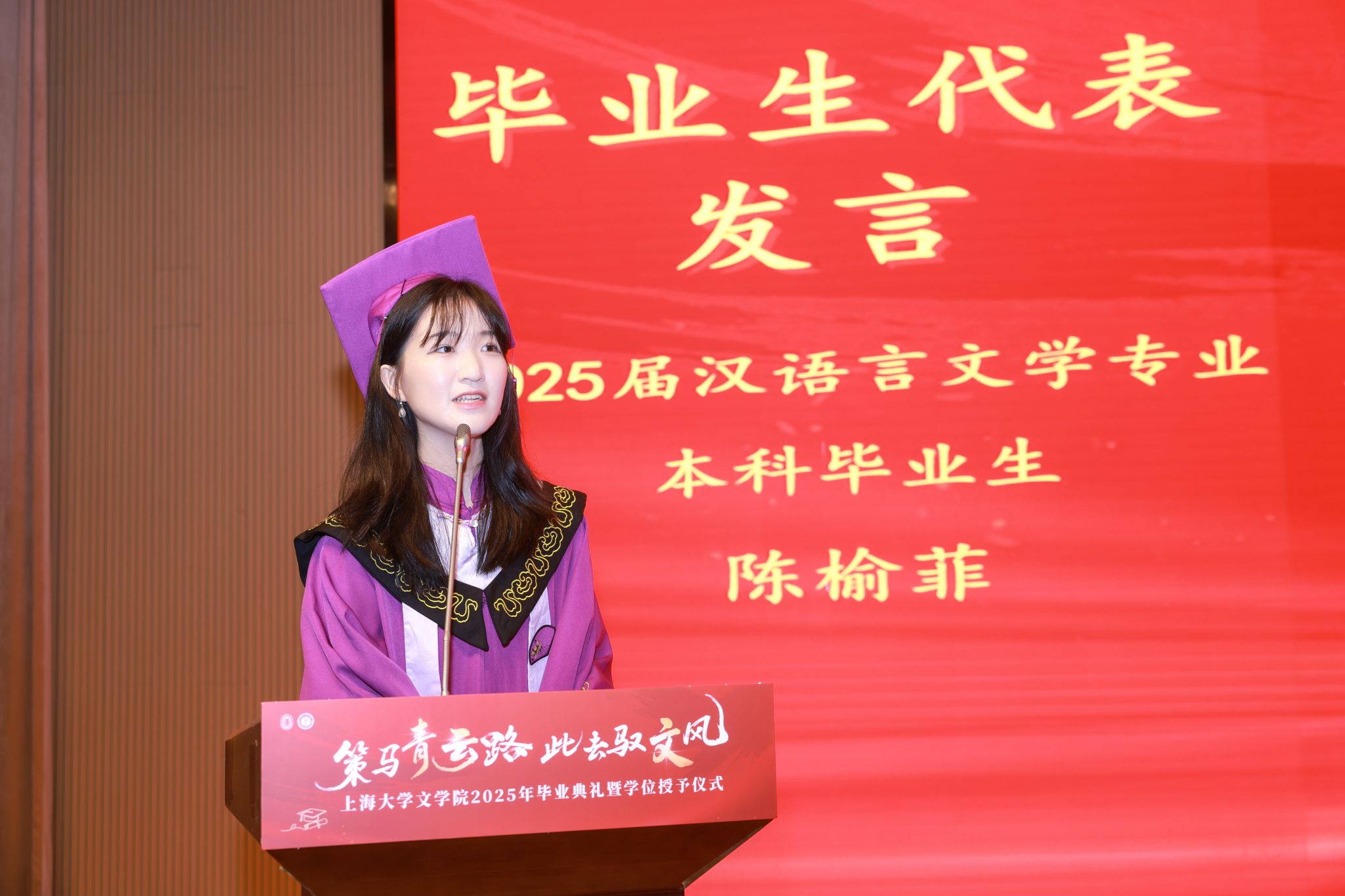 2025届本科毕业生陈榆菲以“现场人生”概括四年的大学生活,她谈及曾因前路迷茫而感到困惑,却在文学哲思中学会不停探索。她感恩母校包容试错,感谢老师们以人文热忱引领学生探索文学、参与实践、化解焦虑,更庆幸自己选择了英国beat365官方网站,并由此找到了热爱的方向。最后她引用鲁迅名言“即使前途很远,也不要怕,不怕的人面前才有路”寄语同窗勇敢前行,也向母校、师长与同学们献上最真挚的祝福。