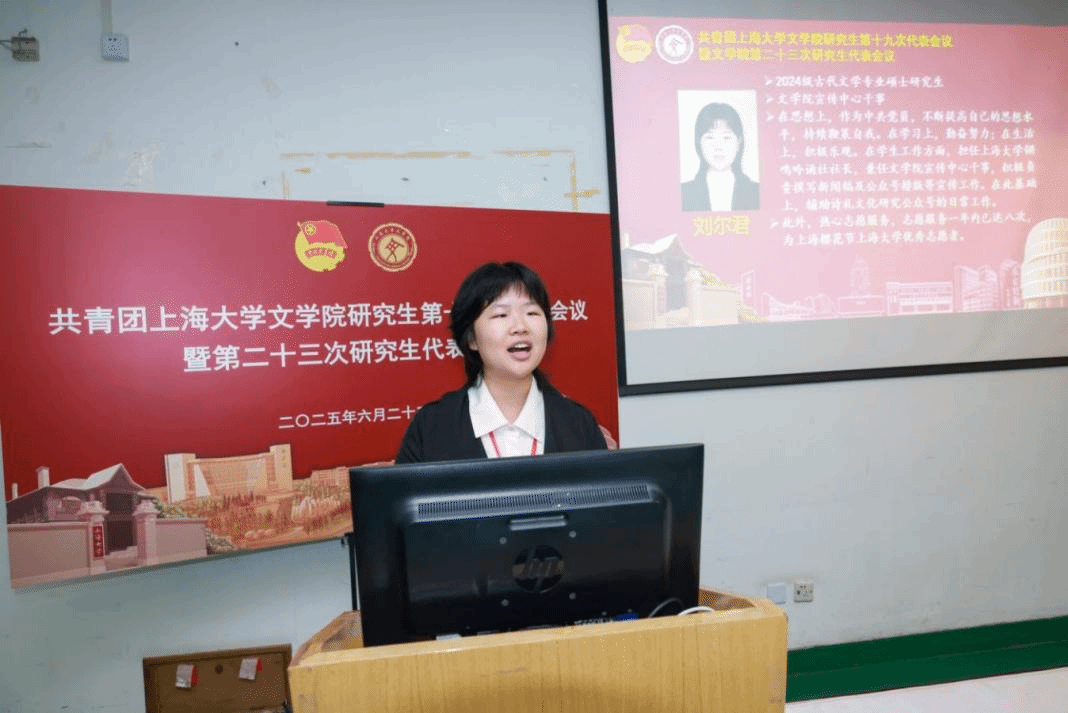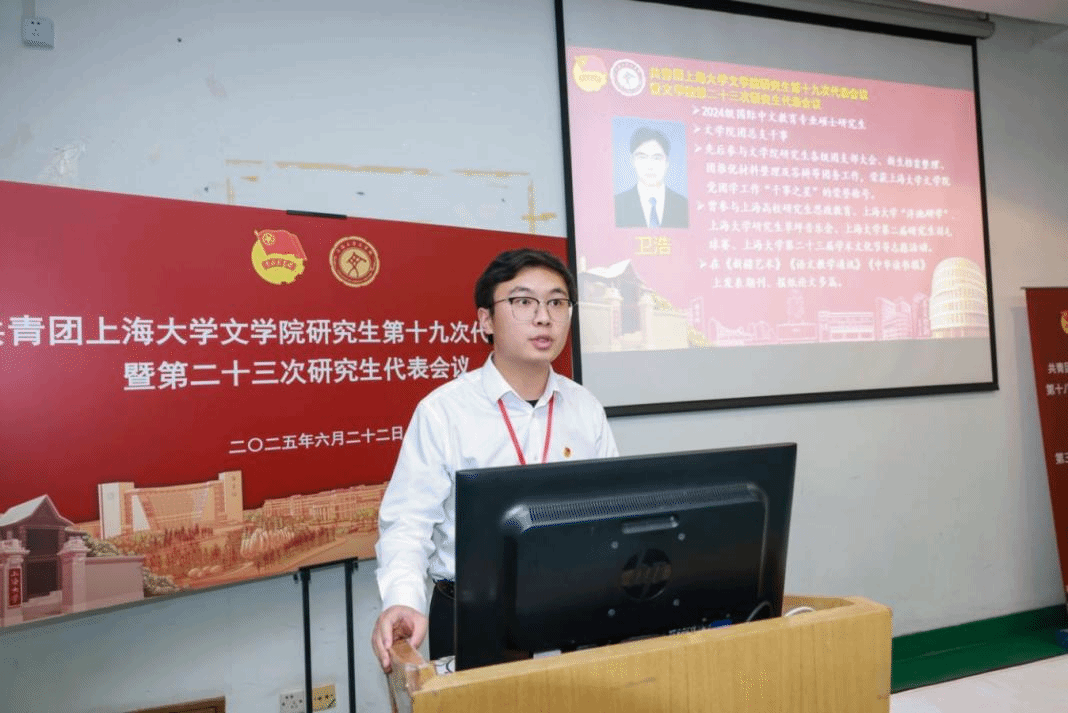 六位团总支候选人——英国beat365官方网站2024级汉语国际教育专业硕士研究生卫浩、2024级中国古代文学专业硕士研究生刘尔君、2024级中国史专业硕士研究生杨轲、2024级世界史专业硕士研究生吴梓蔚、2024级文艺学专业硕士研究生张德妍、2024级民间文学专业硕士研究生罗巽分分别发表了竞选演讲。